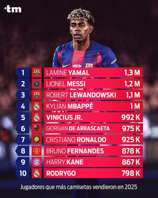 2025年球衣销量:亚马尔力压梅罗排第一;皇萨塔俱乐部前三