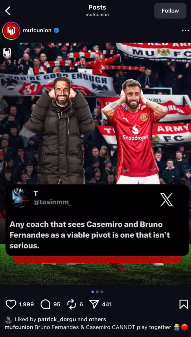 该帖子由账号“mufcunion”发布,内容是一张截图,上面写道:“任何认为卡塞米罗和布鲁诺-费尔南德斯是可行中场搭档的教练,都是不靠谱的。”
