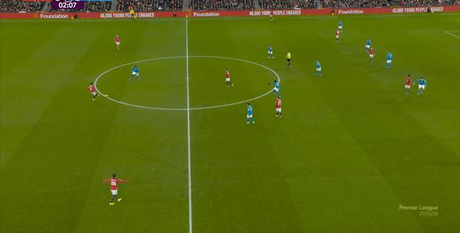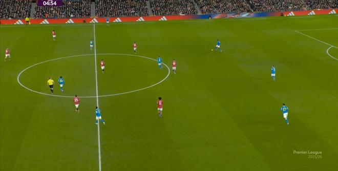 在大面儿上,依然是343的站位,通过这一站位和人员结构来在防守端出力,倒是还说得通,但是在进攻端,开局的曼联已经展现出需要依靠库尼亚单打的情况了: